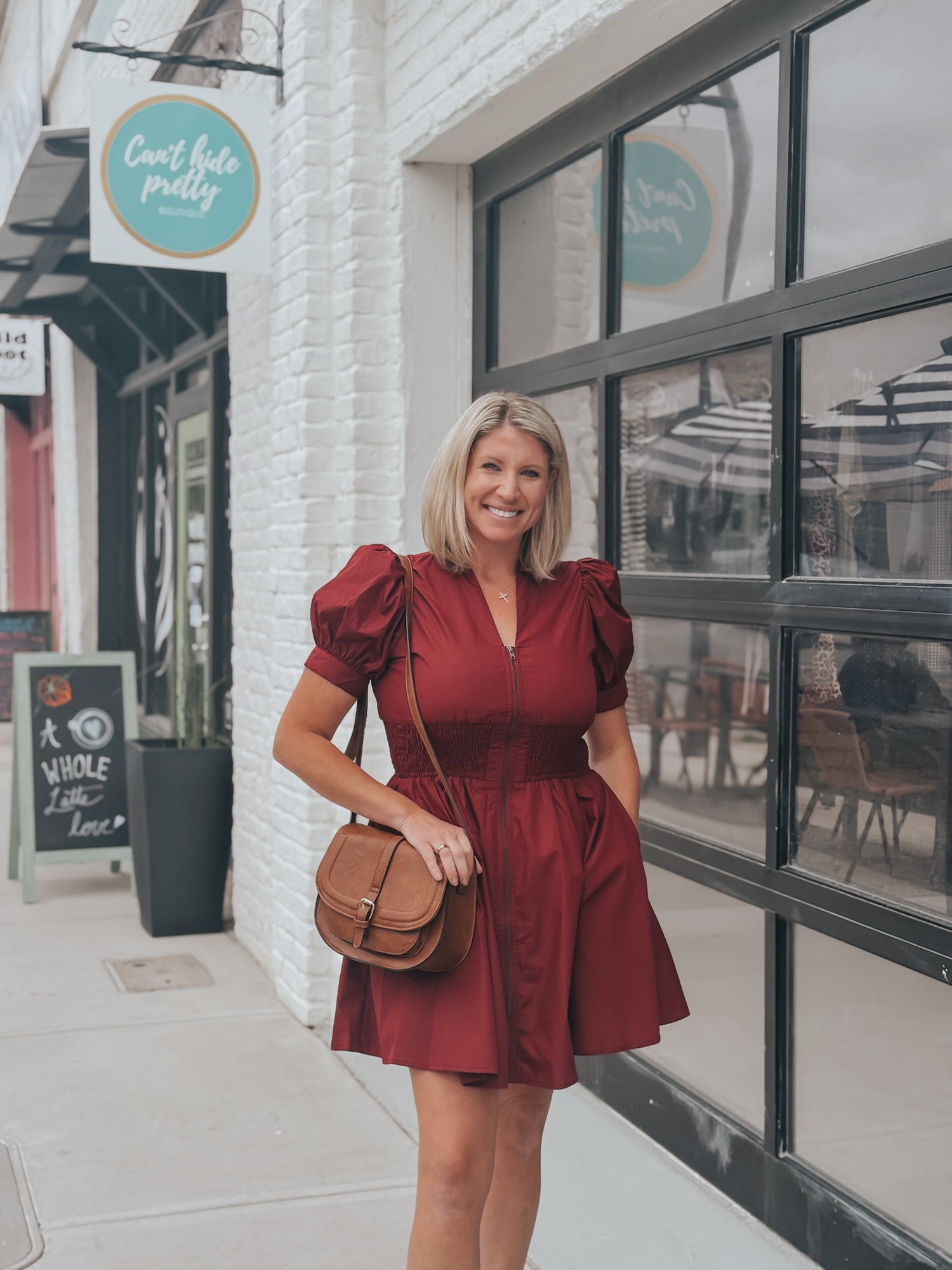 Elevate your wardrobe with the Alyssa Zip Dress, a stunning piece that combines sophistication with modern flair. This deep burgundy mini dress features a flattering cinched waist that defines your silhouette beautifully, while the elegant V-neckline adds a touch of refinement. Slightly puffed sleeves bring playful dimension to the design, and the full zip-up front offers effortless styling versatility. Perfect for transitioning from day to night, this dress delivers the polished look you've been searching for.