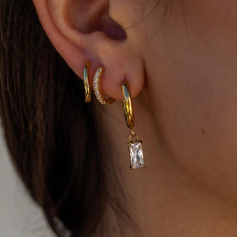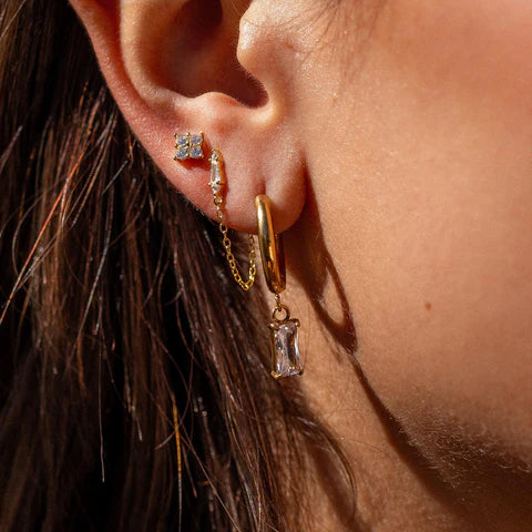 Meet the Aria Huggie - a must-have piece for every jewelry collection. This sleek and stylish earring features a simple gold huggie adorned with a dangling baguette-cut stone. Effortlessly chic and versatile, the Aria Huggie can be dressed up or down to elevate any look.