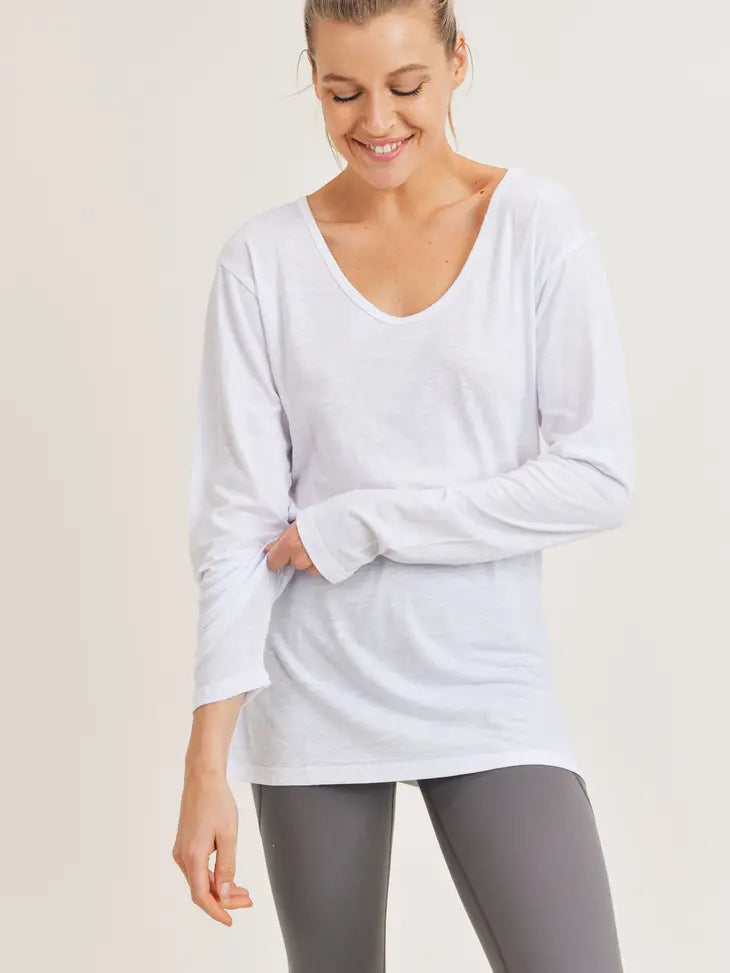Constructed from a 50-50 blend of cotton and modal (with slub jersey knit), this extra soft top has a round neckline, long sleeves, and a semi-longline silhouette. 50% cotton, 50% modal (slub jersey). Extra soft and vintaged-look CMS technology.