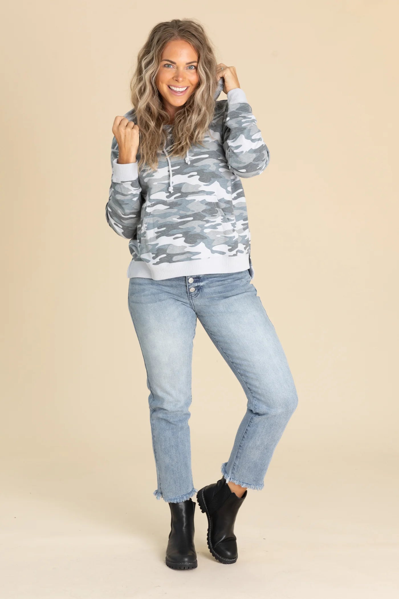 Embrace effortless style and comfort with the Stunn'd Camo Hooded Pullover. Featuring a bold camo print in versatile shades of grey, dusty blue, and charcoal, this long-sleeve hoodie offers a straight hemline for a relaxed fit. Perfect for layering or wearing solo, it combines street-ready design with cozy warmth, making it your go-to pullover for cooler days.