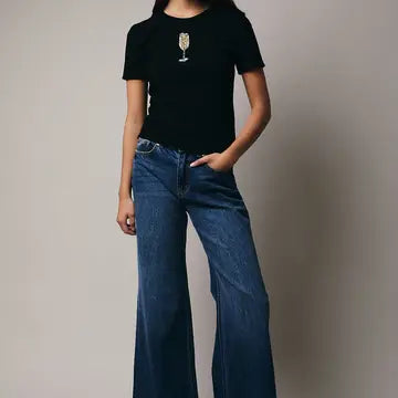Make a bold statement this holiday season with the Champagne Nights Ribbed Top in striking black with shimmering gold beads. This sophisticated short-sleeve piece features a classic round neckline and form-fitting ribbed fabric that flatters every figure. The champagne glass beading in lustrous gold creates an eye-catching contrast against the deep black base, delivering just the right amount of glamour for festive occasions. The ribbed construction ensures a comfortable, sculpted fit that transitions seamlessly from holiday parties to intimate gatherings. Versatile enough to dress up or down, this elegant top pairs effortlessly with your favorite bottoms and becomes an instant go-to for creating memorable holiday looks that radiate confidence and style.