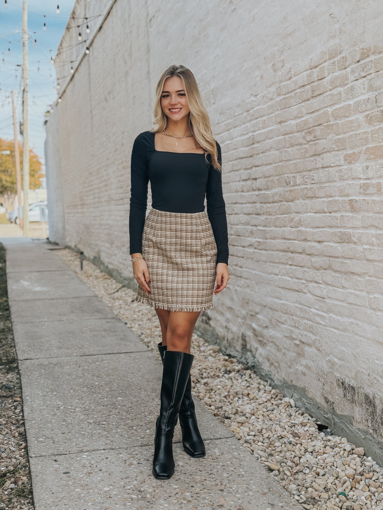 Elevate your style game with our chic tweed mini skirt in brown and camel. With an unfinished bottom and hitting right above the knee, it's the perfect choice for all your holiday fall and autumn parties. Don't miss out on this versatile piece for hanging out with friends!