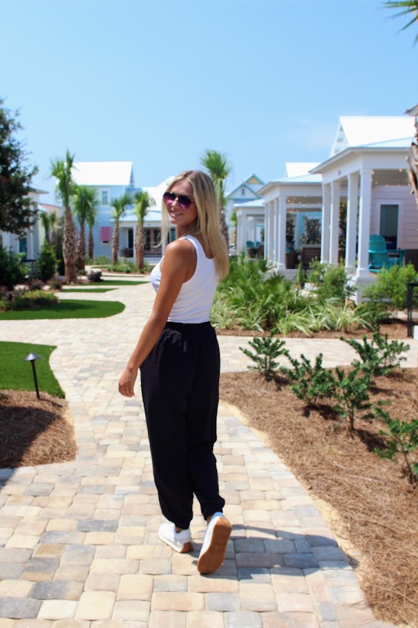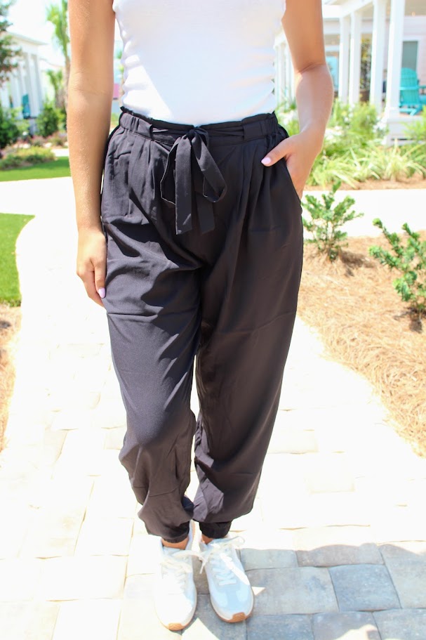 adjustable waist line, tie front and elastic ankle- classic jogger style.