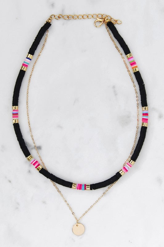 Elevate your summer style with our Clay Vacay Necklace Stack! This colorful polymer clay disc necklace is perfect for adding a pop of fun to any outfit. The soft clay disks are accented with a gold layered chain and circle charm. Available in 6 vibrant colors, it's the perfect accessory for your summer vacation.