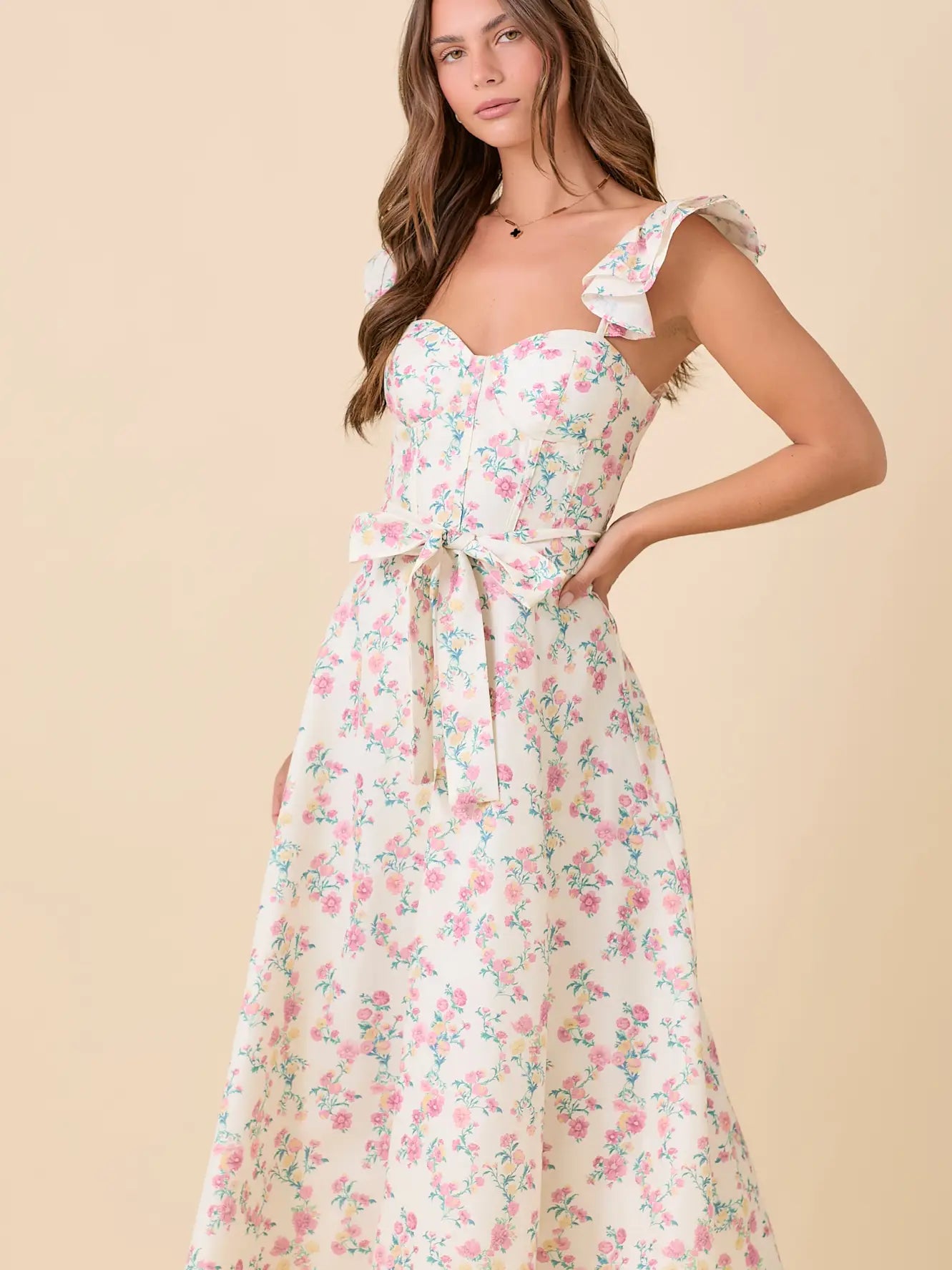 This midi dress, perfect for wedding guests, features a self-tie belt and delicate ruffle straps. Its light floral pattern adds a dreamy touch, making it an ideal choice for a memorable day.