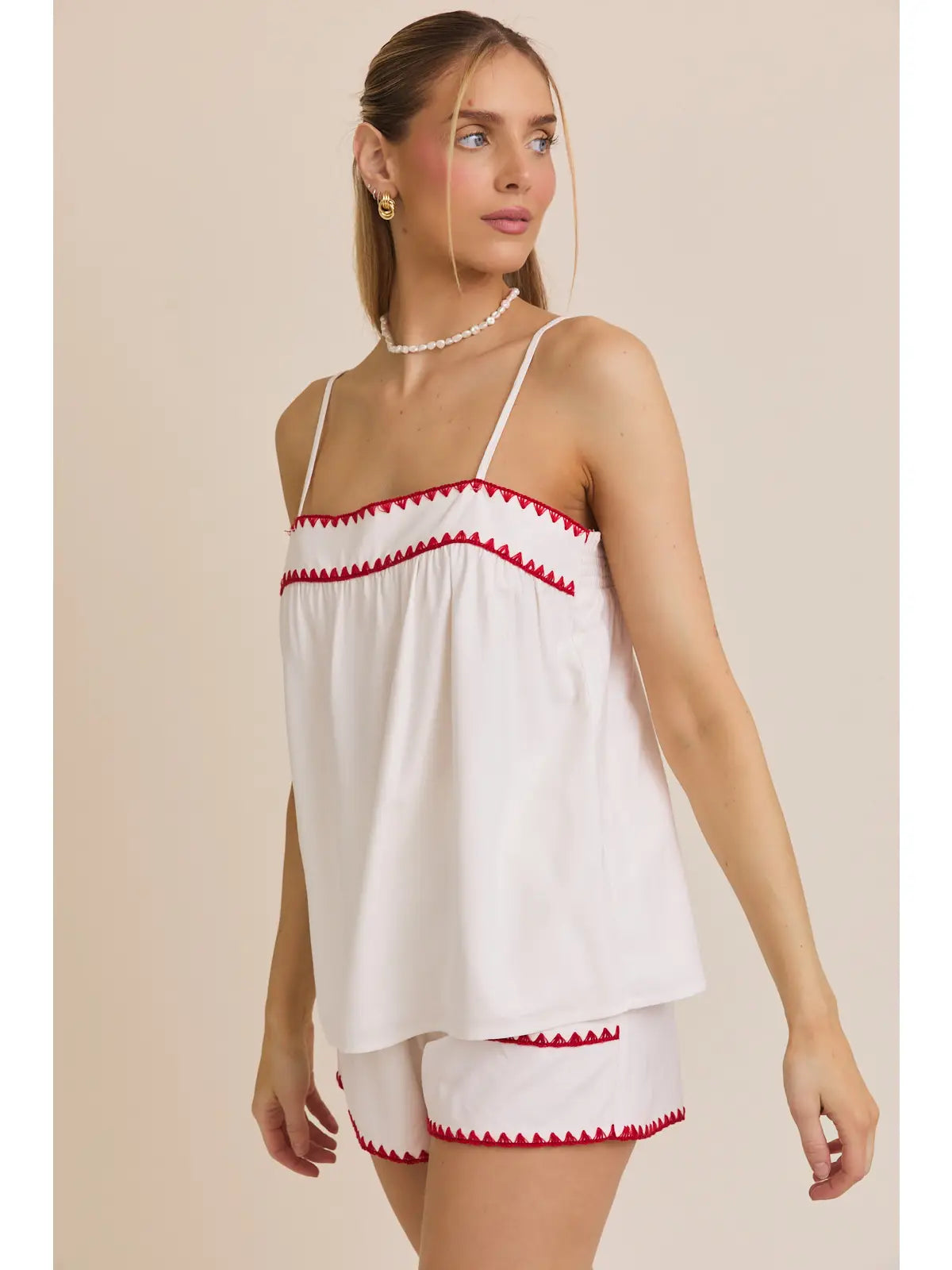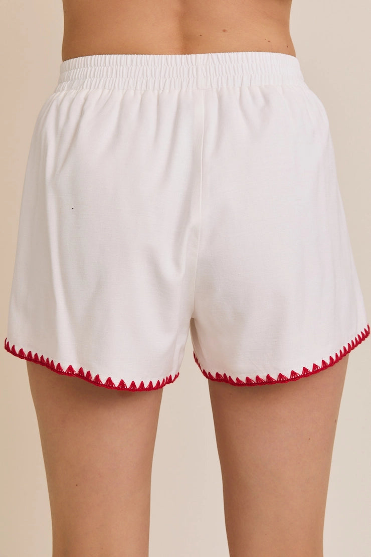 Embrace the spirit of Summer with these fun shorts, perfect as part of a matching set or worn solo. Featuring a comfy elastic waistband, they come in crisp white with bright red stitching. This outfit captures the essence of sunny days—grab a cold drink, soak up the rays, and savor those warm summer evenings.