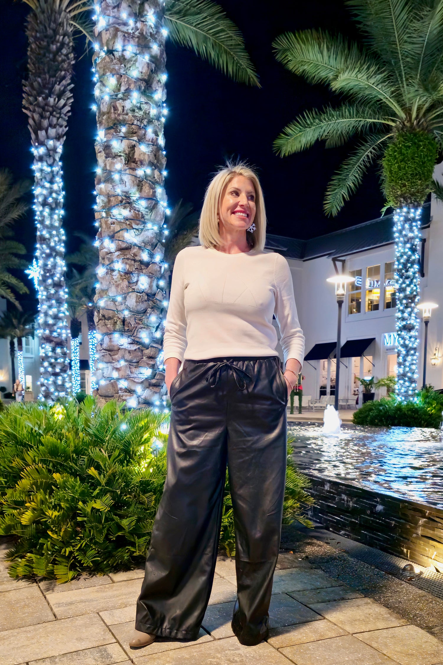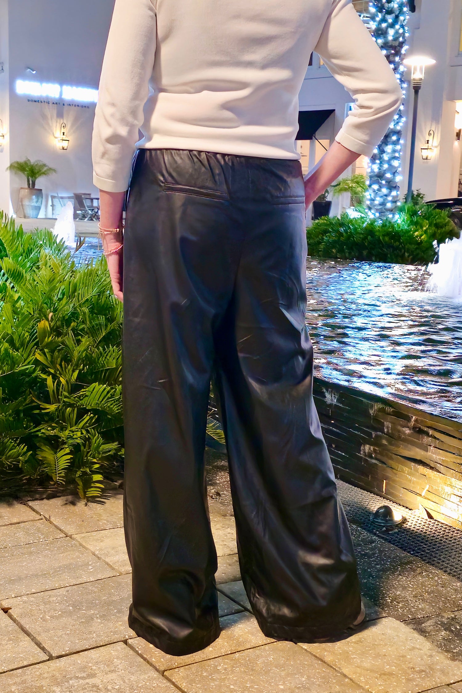 Get ready to turn heads in these faux leather pants! Featuring an elasticized waist with tie detail, side pockets, and a wide leg, these pants are both stylish and comfortable.