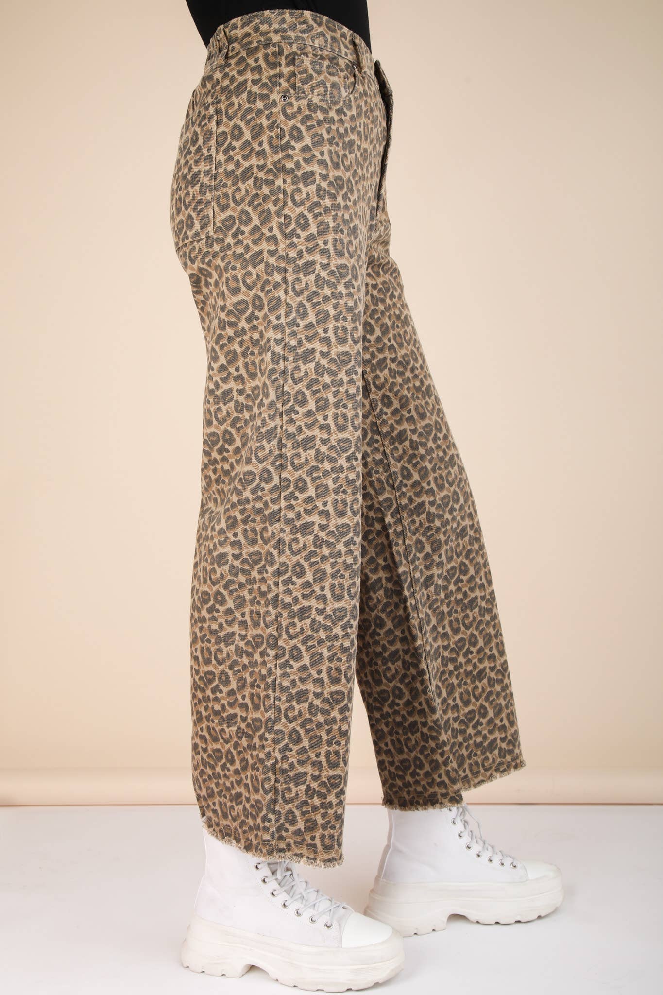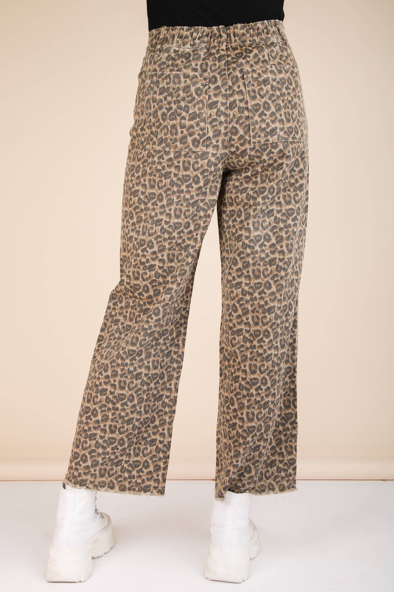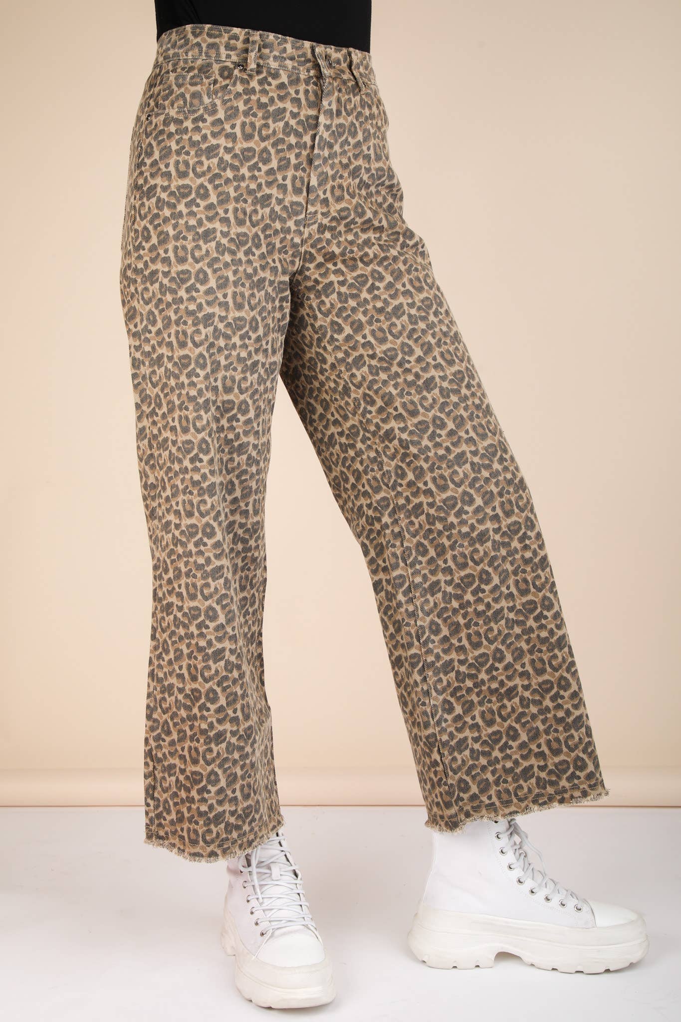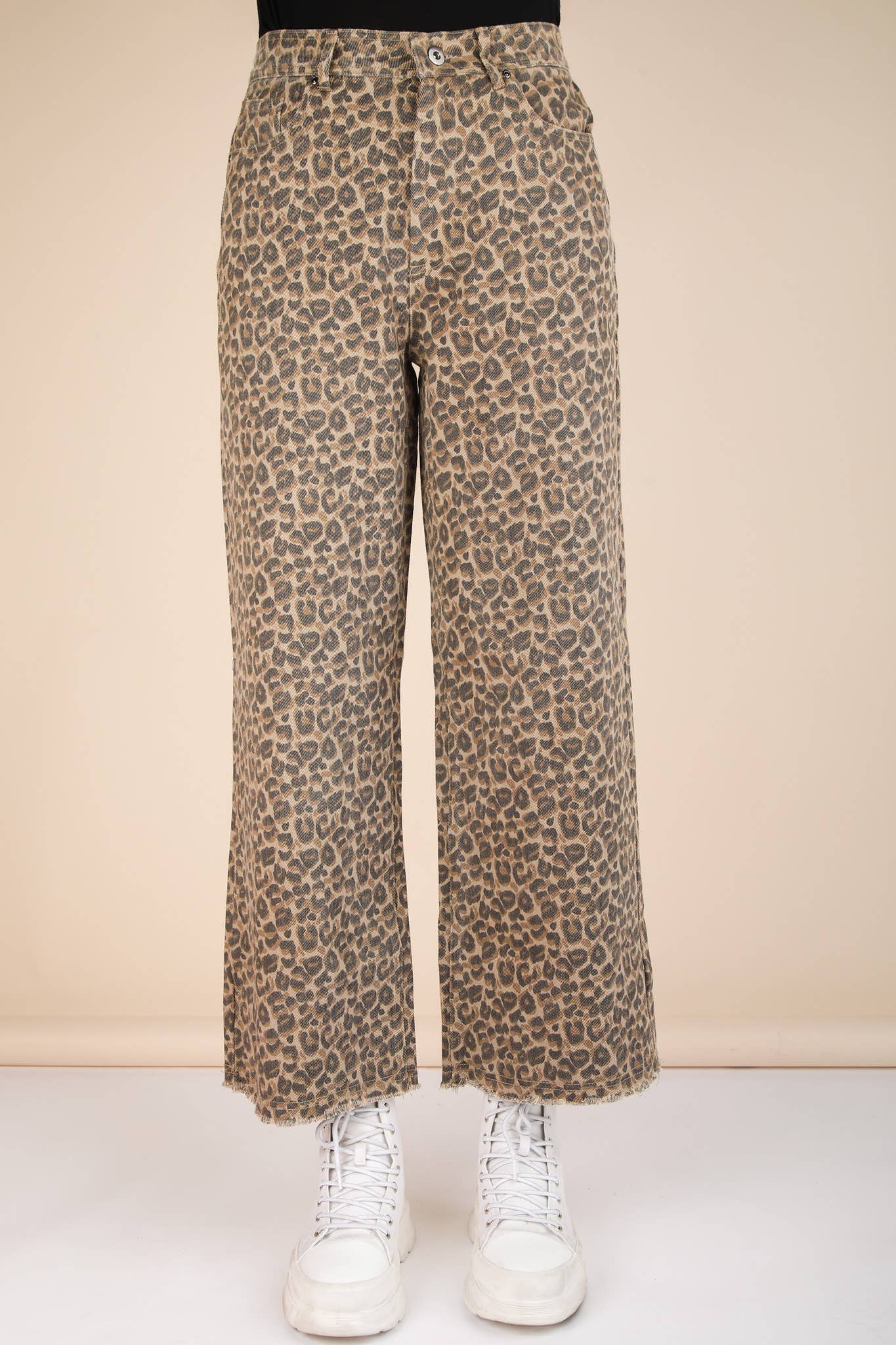 Unleash your wild side with our Cropped Leopard Pants! These straight pants feature a fierce leopard print, front button & zipper, and a back elastic waist for a comfortable fit. Complete with frayed hem, belt loops, and side & back pockets. Perfect for adding a touch of excitement to your wardrobe. Model height: 5'7", wearing a Small.
