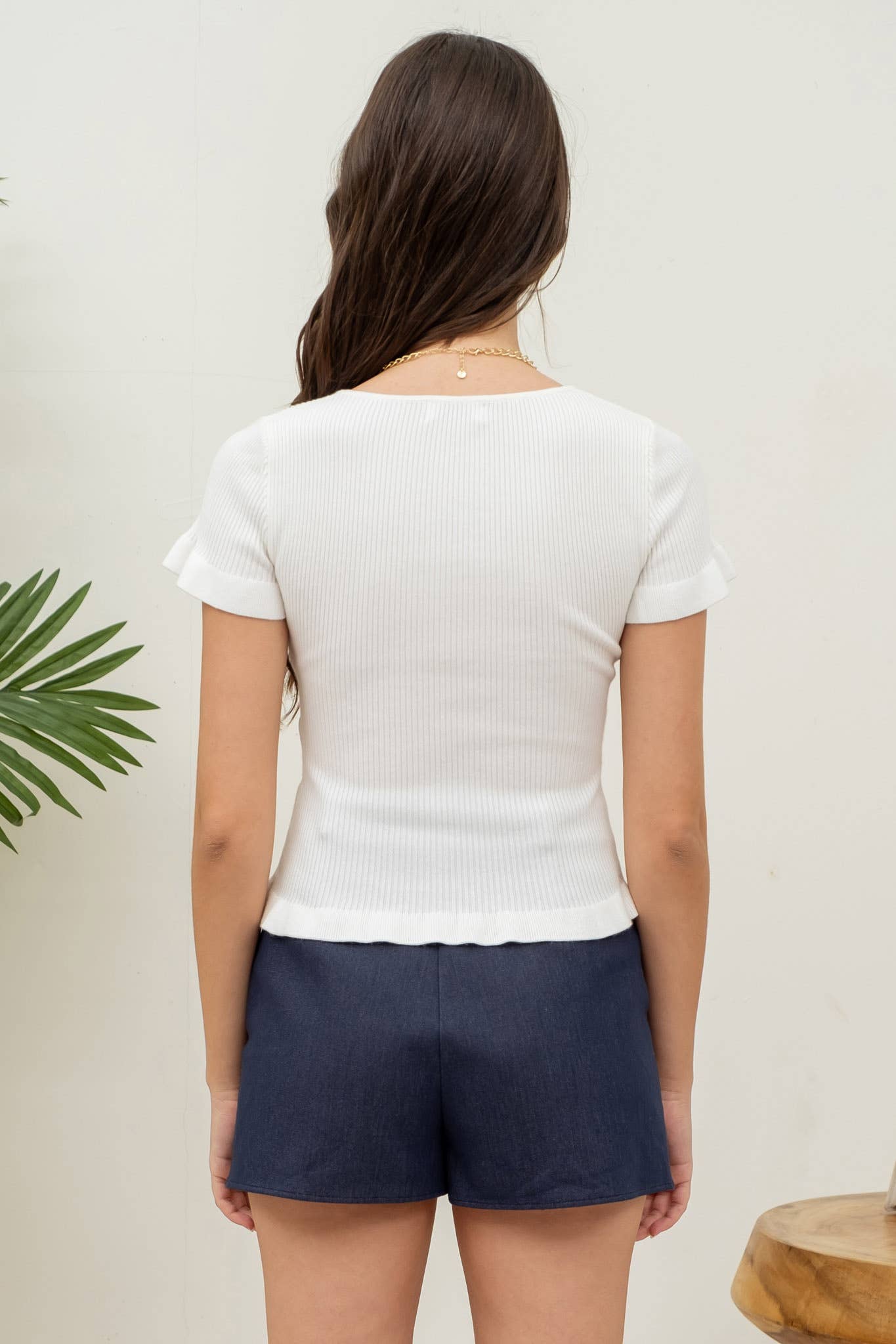 Get ready for a wardrobe refresh with our essential and effortless ribbed knit top! Perfect for any occasion, this top features a scoop neckline, short sleeves, and a playful lettuce hem. Crafted from a luxurious blend of 70% viscose and 30% polyester, it's a must-have addition to your collection.