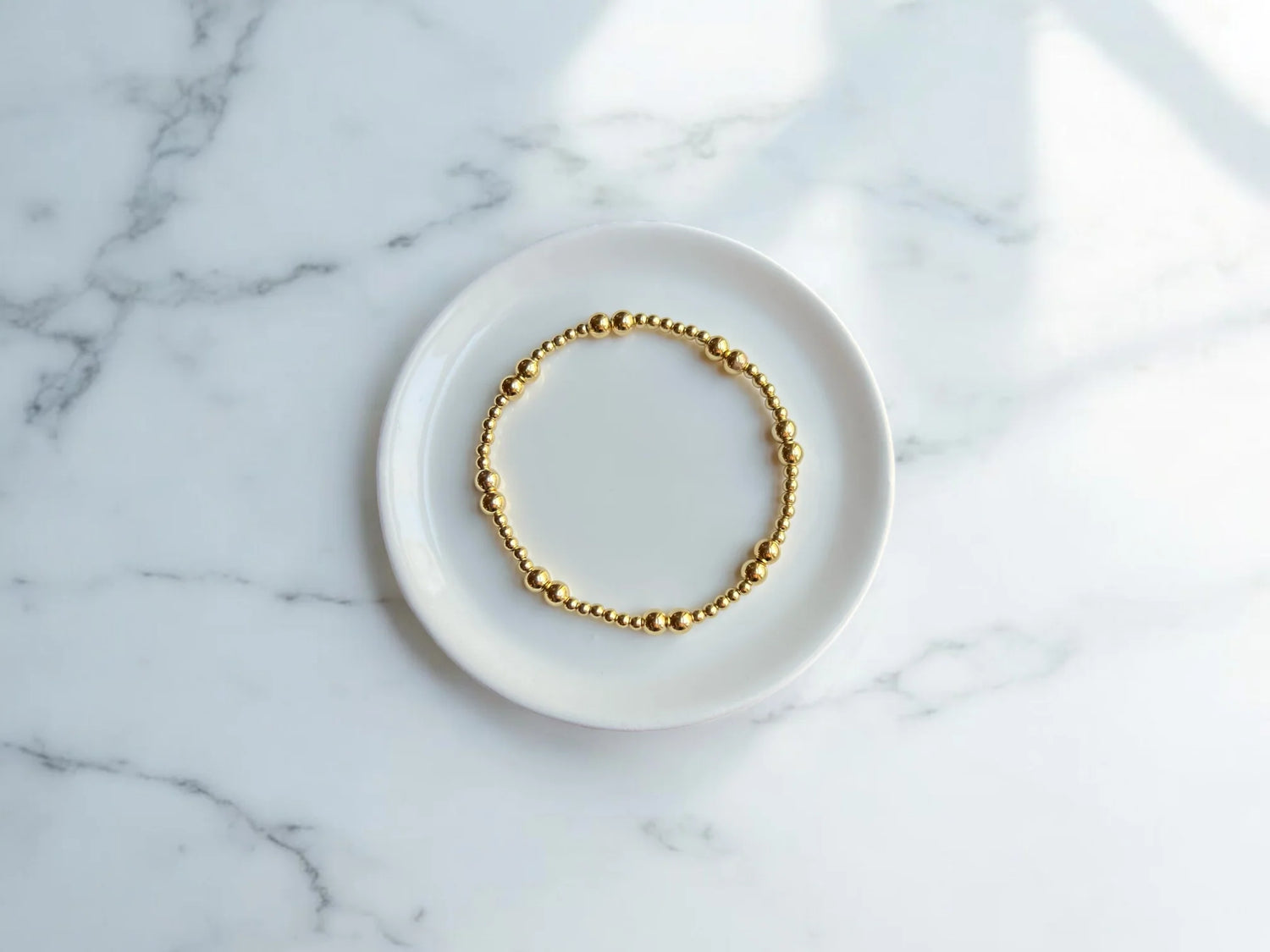 The Bridget is a refined take on a classic. A daintier version of the Catherine, this bracelet features a playful mix of 5mm and 3mm 18K gold-filled beads. A subtle yet stylish way to add dimension and fun to an all-gold stack.