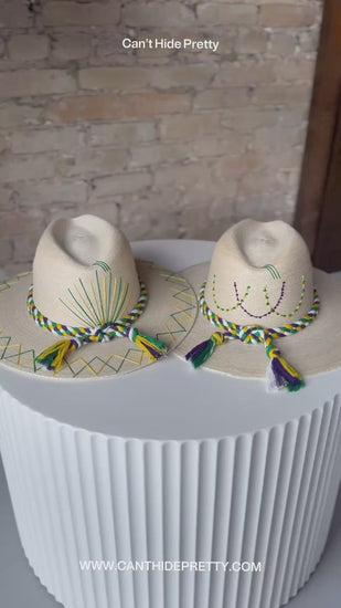 Calling all Mardi Gras enthusiasts, this hat is just for you! Crafted with care, these fun and vibrant hats feature stunning embellishments and a one-of-a-kind design. With an elastic band inside, they ensure a snug fit, and they're also resistant to the weather and water.