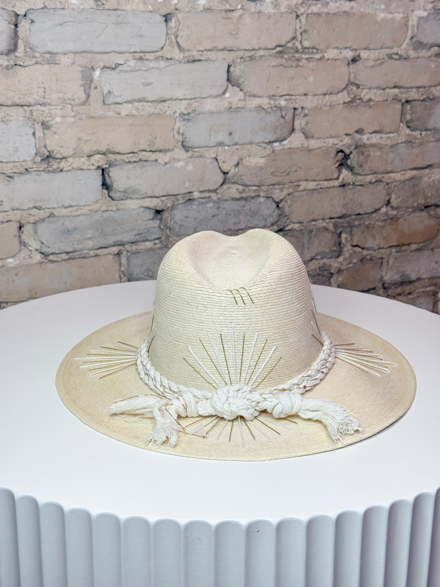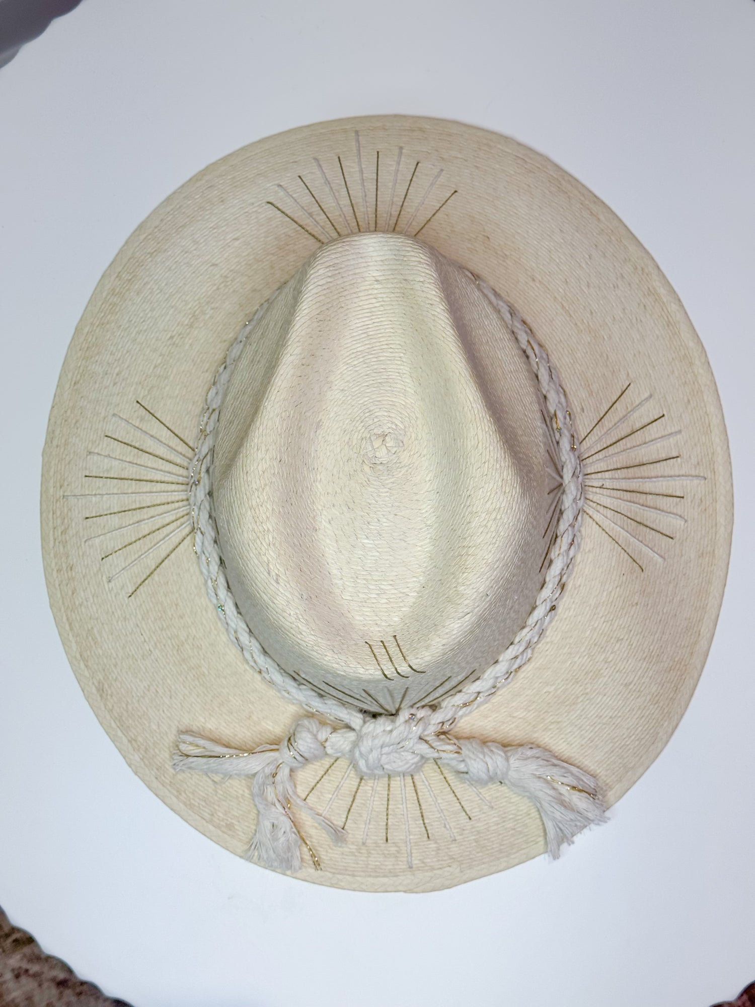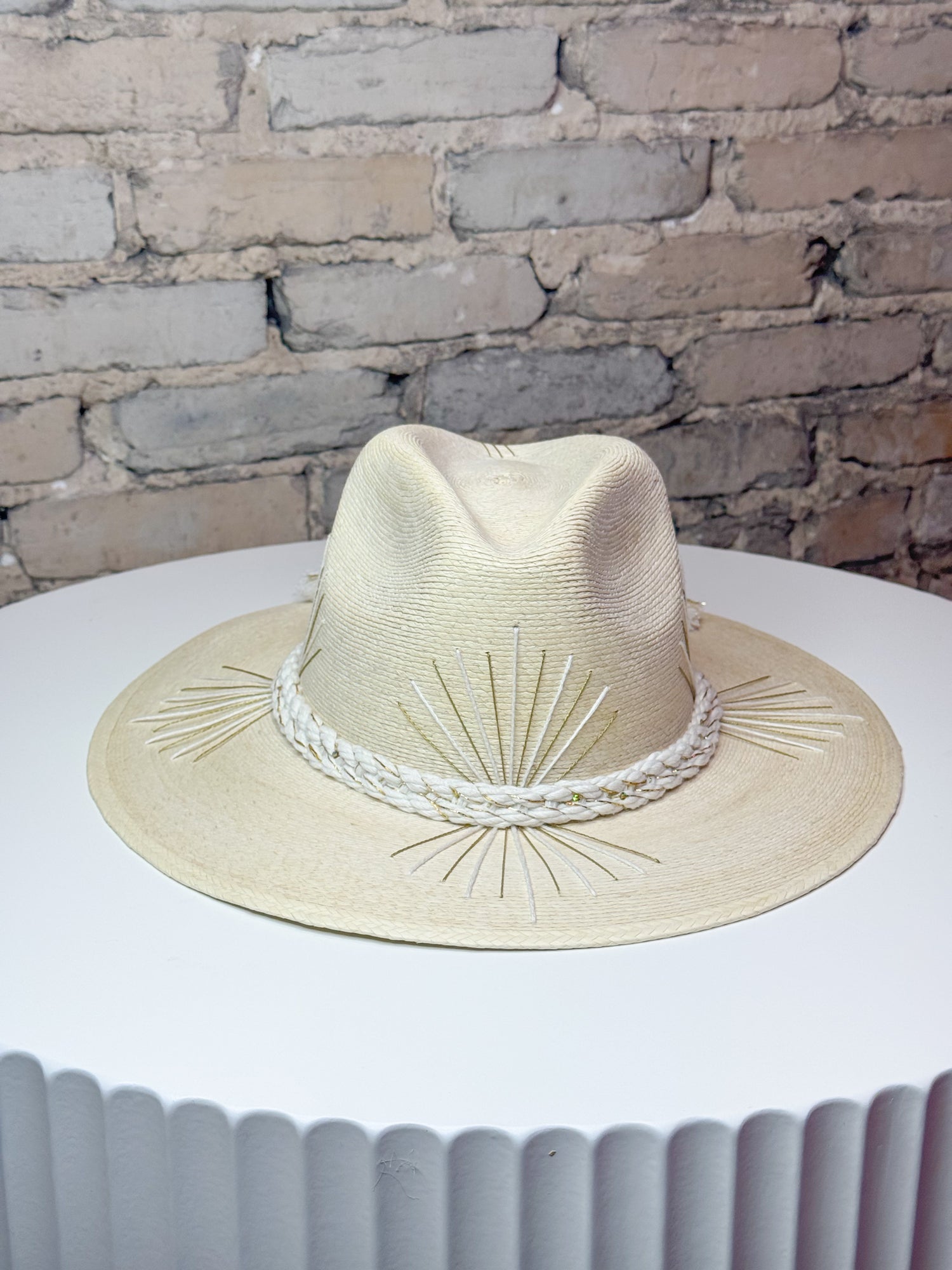 Experience the elegance of the PALM Cabo Double, handcrafted in Atlanta, Georgia. Its natural palm coloring and elastic band ensure a comfortable, adjustable fit. The braided design encircles your head beautifully, enhanced by shimmering gold and white glitter stitching that adds a touch of sparkle to any outfit. Perfect for those seeking a unique, stylish accessory with a personal touch.