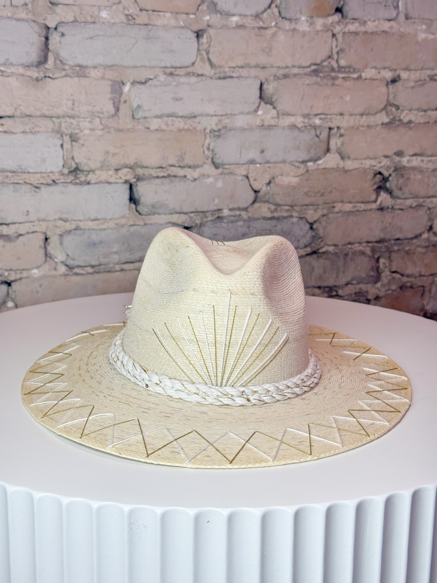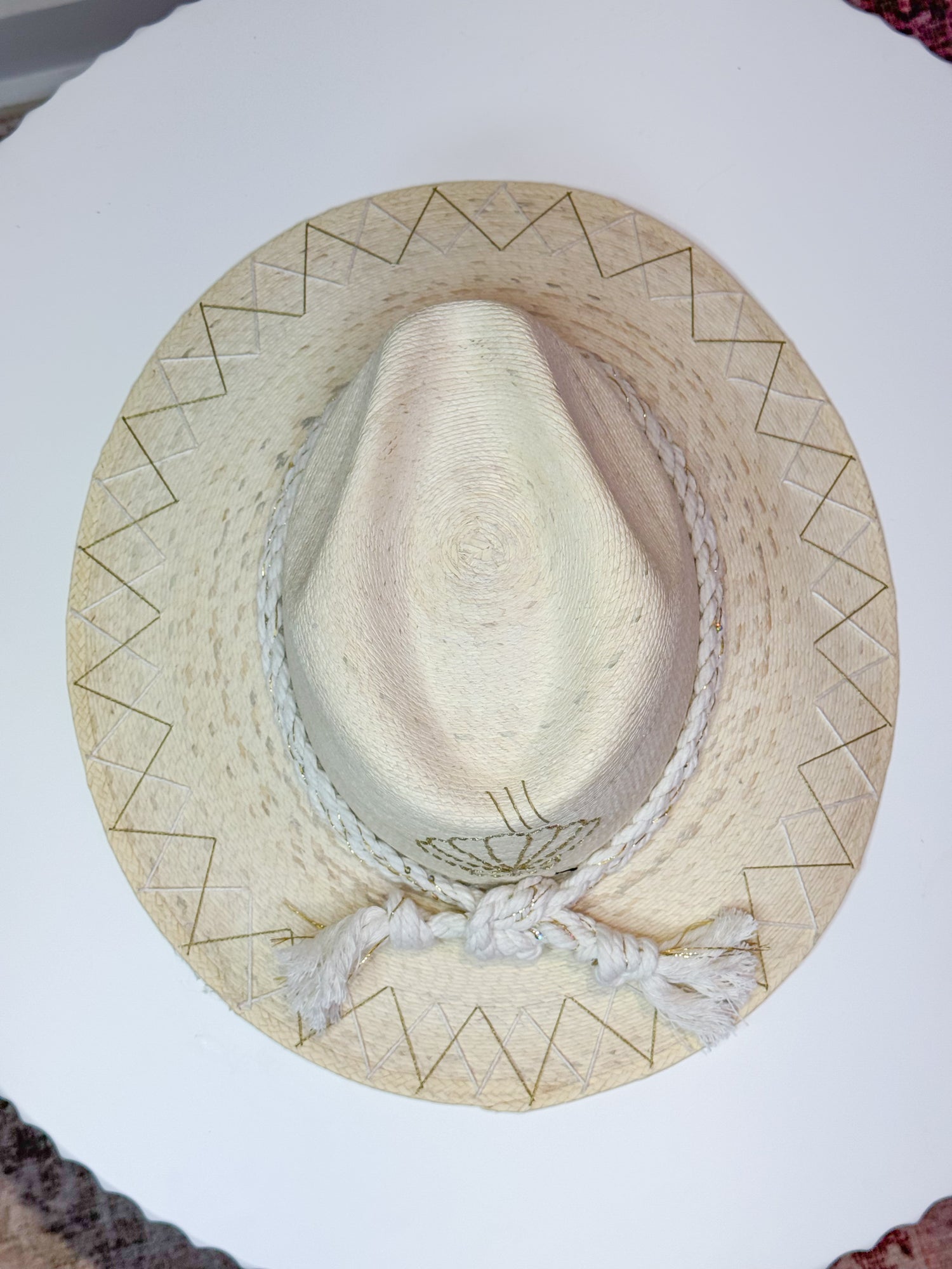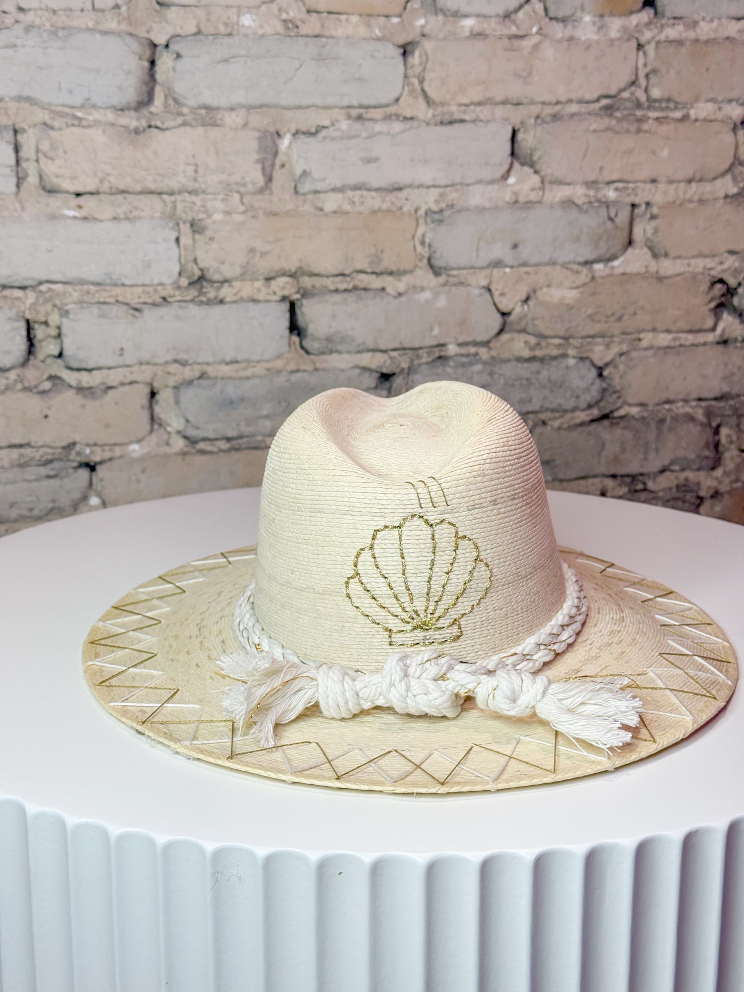 Experience the elegance of the PALM Cabo Shell, handcrafted in Atlanta, Georgia. Its natural palm coloring and elastic band ensure a comfortable, adjustable fit. The braided design encircles your head beautifully, enhanced by shimmering gold and white glitter stitching that adds a touch of sparkle to any outfit. Hand stitched Seashell on the front of the hat. Perfect for those seeking a unique, stylish accessory with a personal touch.