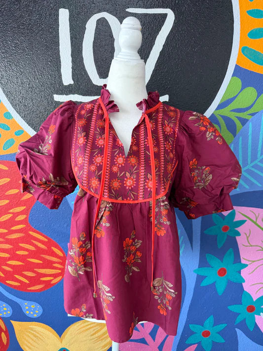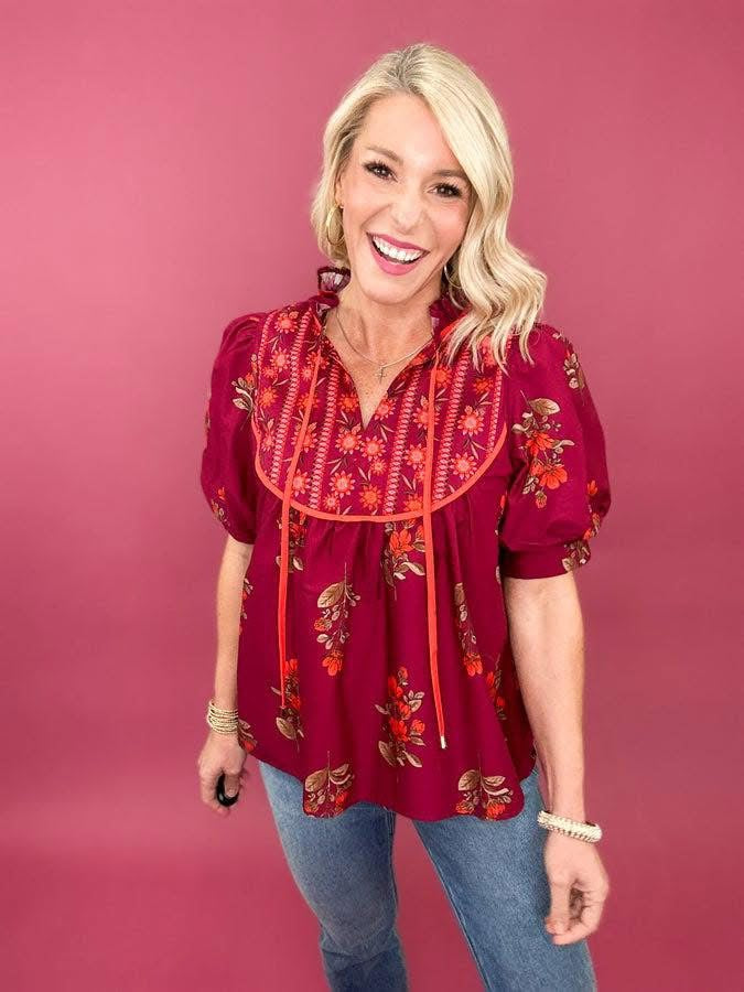 Elevate your wardrobe with this charming wine-hued Entro top that brings the fun with a vibrant orange accent. The delicate puff sleeves add a touch of whimsy, while the flattering V-neck and ruffled trim create effortless elegance. Perfect for layering or wearing solo, this full-length beauty is ready to turn heads.