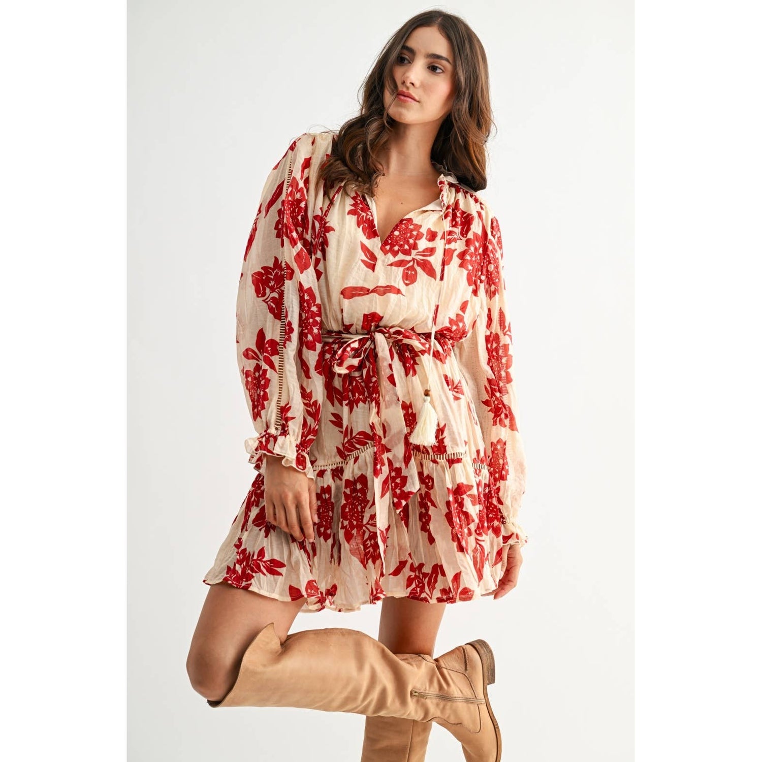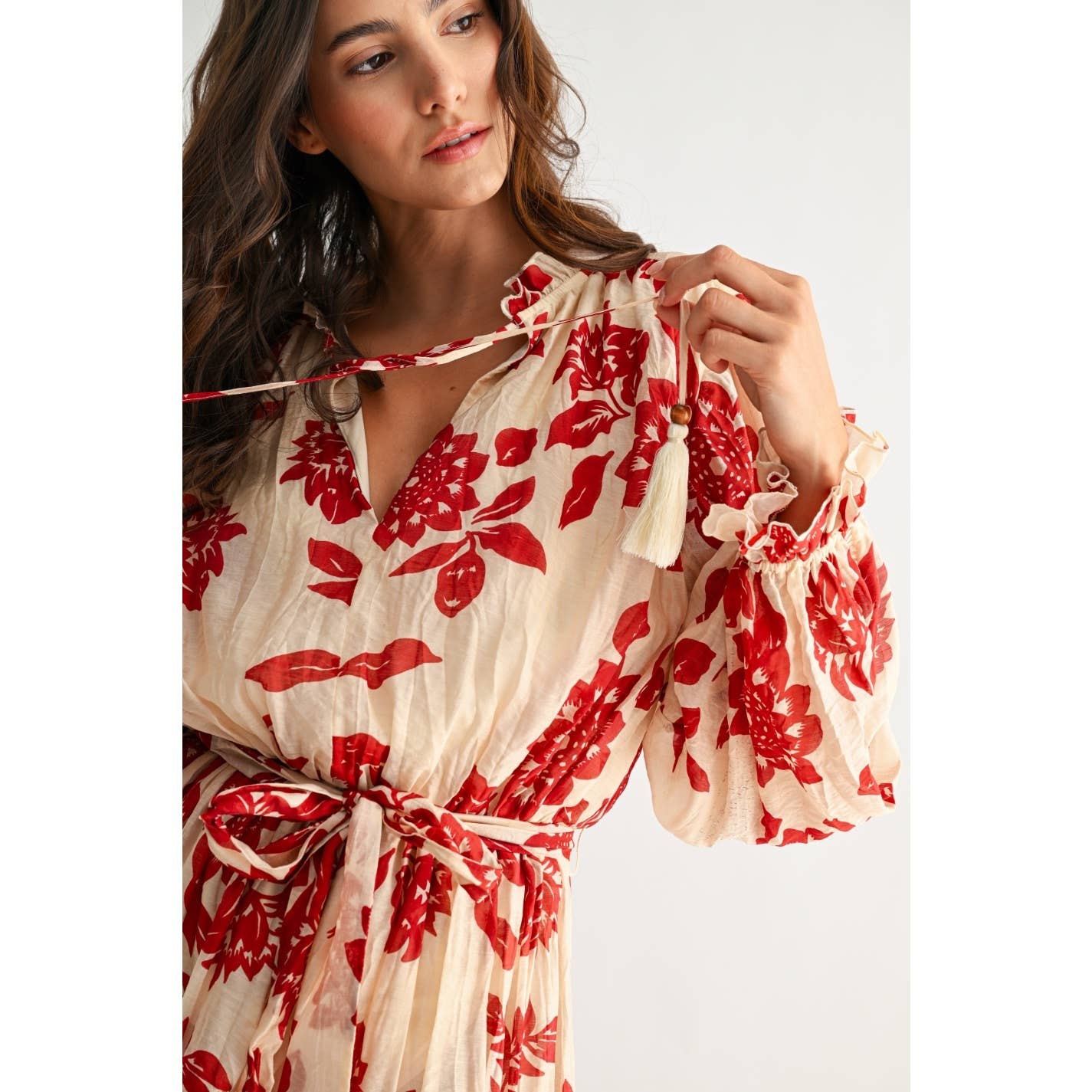 Presenting an exquisite addition to any high-end wardrobe, this red and cream floral print dress delivers both style and poise. Designed with discerning corporate professionals in mind, this dress seamlessly transitions from business luncheons to elevated after-hours events, all while ensuring a polished and professional appearance. SELF: 80% COTTON 20% TENCEL LINING: 100% POLYESTER Model is wearing a size S Model : 5'9" - B 32" - W 24" - H 35"