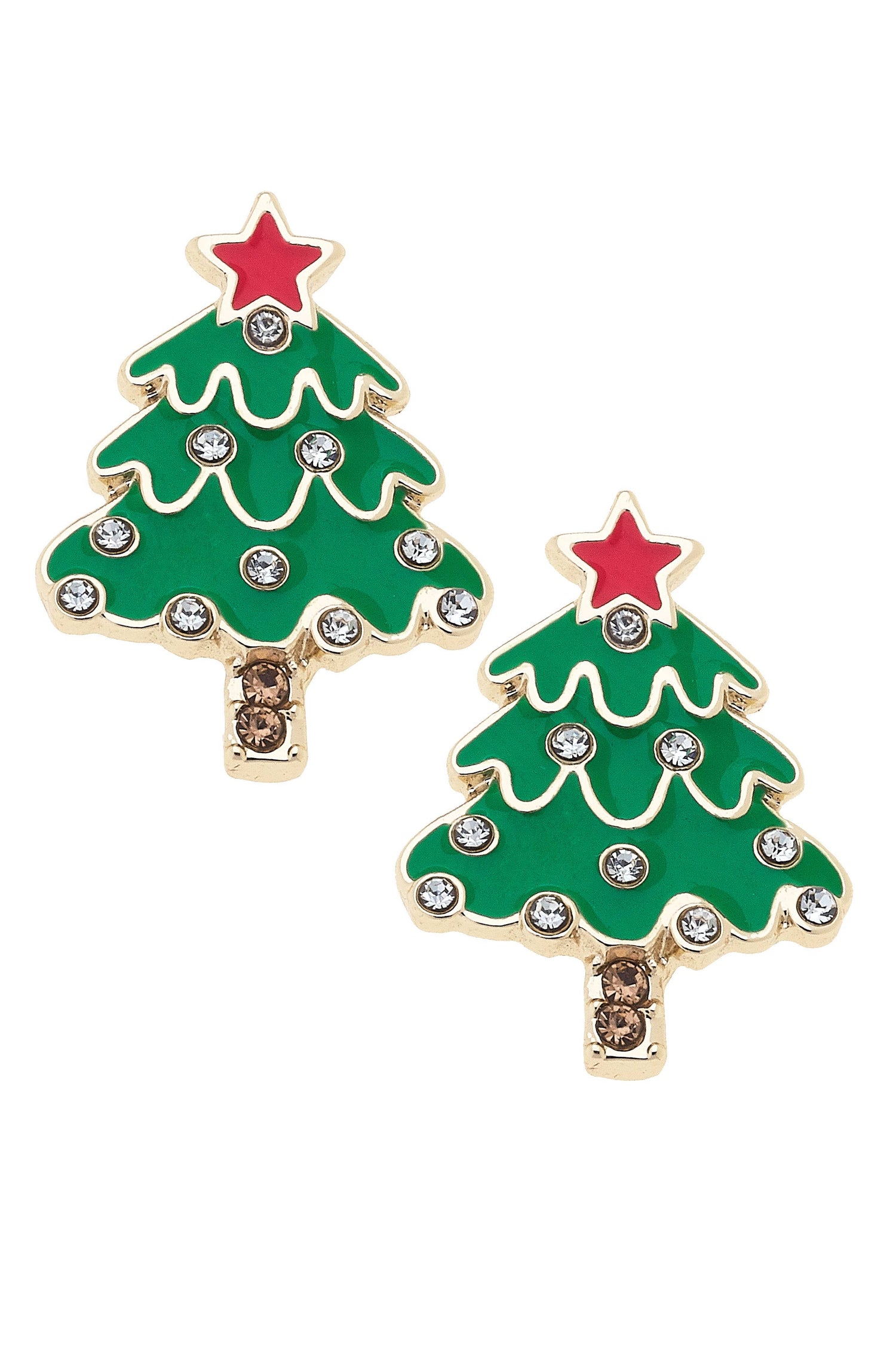 Sparkly Christmas trees adorned with glittering rhinestones make these studs a festive must-have. Wear a miniature winter wonderland right on your ears with these delightful earrings that capture all the magic of the season. Featuring 18K triple gold plating and measuring .75"L x .625"W, they're the perfect size for adding holiday glamour to your everyday look.