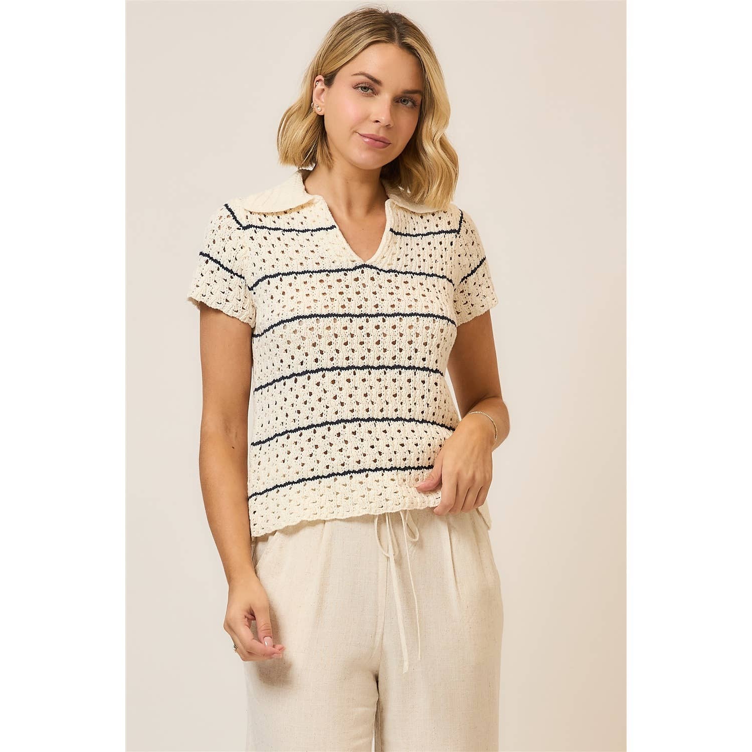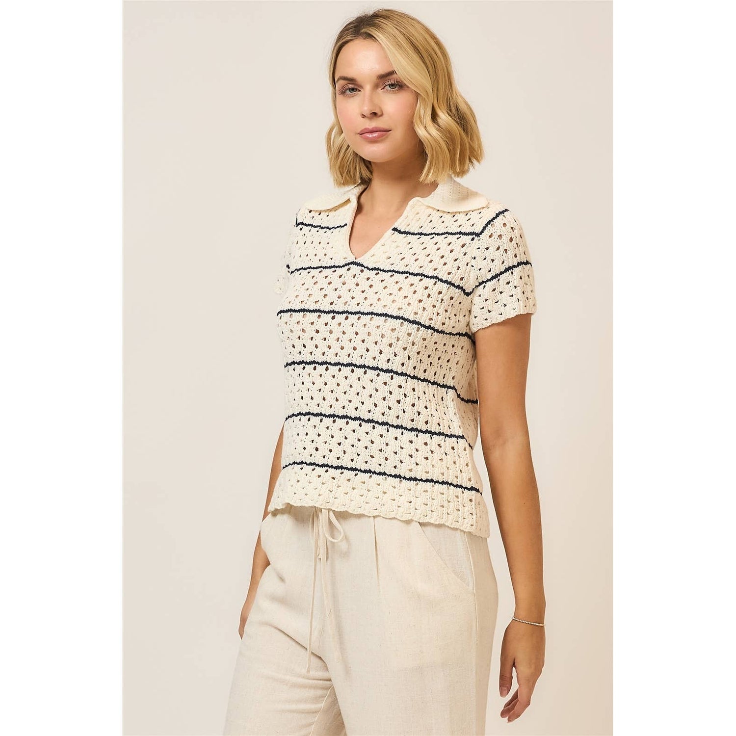 Striped Open Knit Short Sleeve Collar Top - Model is 5' 9" 32-25-35 wearing a size S/M
